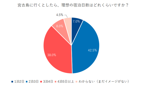 宮古島旅行について理想の宿泊日数をたずねたところ、「1泊2日」7.0%、「2泊3日」42.5%、「3泊4日」38.0%、「4泊5日以上」8.0%、「わからない(まだイメージがない)」4.5%でした。