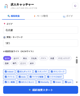 「求人キャッチャー」は、エリアとキーワードを入力して検索を開始するだけで、日本国内の主要求人サイト84サイトを横断検索し、求人タイトル、企業名、給与、勤務地、雇用形態、求人概要などの情報を一括で収集できるChrome拡張機能です。