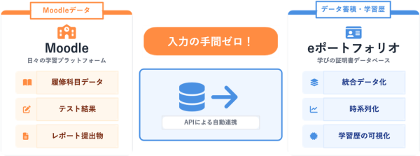 本機能では、「Moodle(ムードル)」にて学習した結果や途中経過を、「履修実績」「テスト実績」「課題実績」として自動的に集約し、入学から卒業までの学習プロセスを「成長の証明書」 として一元管理することを可能にします。