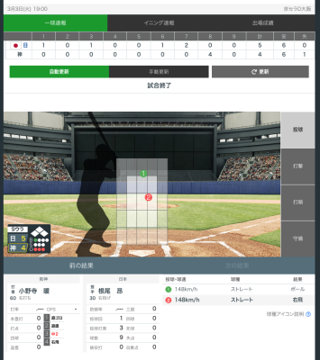 ・一球速報:1球ごとの球種・球速・コース、打球方向などをリアルタイムに可視化