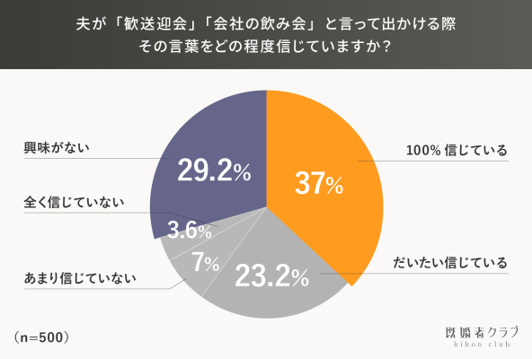 ・「歓送迎会」「会社の飲み会」という夫の言葉を「100%信じている」が最多(37%)