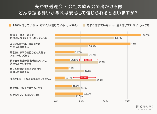 前の設問の回答結果をもとに、「100%信じている・だいたい信じている」層(n=301)と「あまり信じていない・全く信じていない」層(n=53)に分けて、「安心して夫を信じられると思う振る舞い」について比較したところ、両層の間で顕著な差が見られました。