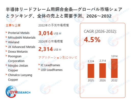 QY Research株式会社(東京都中央区)は、「半導体リードフレーム用銅合金条―グローバル市場シェアとランキング、全体の売上と需要予測、2026~2032」の最新レポートを発表しました。