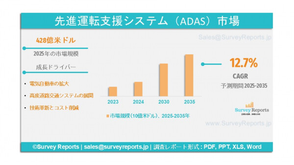 Surveyreportsの専門家によるADAS市場調査の分析によれば、2025年における先進運転支援システム(ADAS)市場の規模は428億米ドルであった。また、2035年末までに1,057億米ドルに達すると予測されている。予測期間である2025年から2035年にかけて、ADAS市場は年平均成長率(CAGR)約12.7%で成長すると見込まれている。