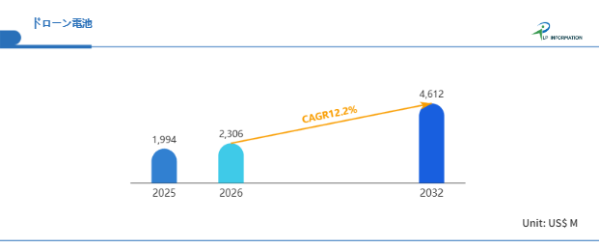 LP Informationの調査レポート「世界ドローン電池市場の成長予測2026~2032」(https://www.lpinformation.jp/reports/593043/drone-battery)によると、2026年から2032年の予測期間中のCAGRが12.2%で、2032年までにグローバルドローン電池市場規模は46.12億米ドルに達すると予測されている。市場拡大の本質は、消費者用途の裾野よりも、産業・特殊任務用途の「稼働率KPI化」にある。点検・測量・警備・農業・物流・災害対応では、航続時間の延伸と安全性の担保が直接収益へ結び付くため、電池は消耗品から運用資産へ格上げされる。