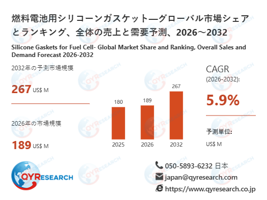 2032年の世界燃料電池用シリコーンガスケット市場は約267百万米ドルに達すると見込まれています。今後の成長軌道は年平均成長率(CAGR)5.9%で推移し、2026年には市場規模が189百万米ドル、2025年時点では約180百万米ドルと推計されています。