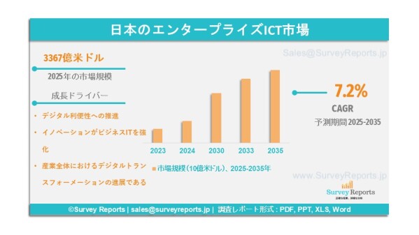 Surveyreportsの専門家による日本の企業向けICT市場に関する調査分析によれば、同市場規模は2025年に3,367億米ドルを創出した。さらに、日本の企業向けICT市場は2035年末までに6,254億米ドルの収益規模に達すると予測されている。日本の企業向けICT市場は、2025年から2035年の予測期間において、約7.2%の年平均成長率(CAGR)で成長すると見込まれている。