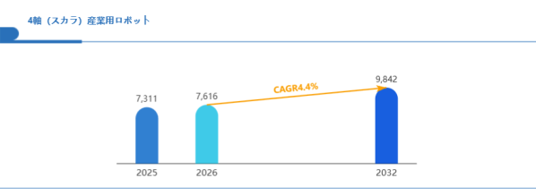 Global reports調査チームの最新レポート「グローバル4軸(スカラ)産業用ロボット市場規模、主要企業シェア、ランキング分析レポート【2026年版】」によると、グローバル4軸(スカラ)産業用ロボット市場は2025年の7311百万米ドルから2032年には9842百万米ドルに成長し、2026年の市場規模は約7616百万米ドルと推計されており、2026-2032年のCAGR(年間成長率)が4.4%に達すると予測されている。