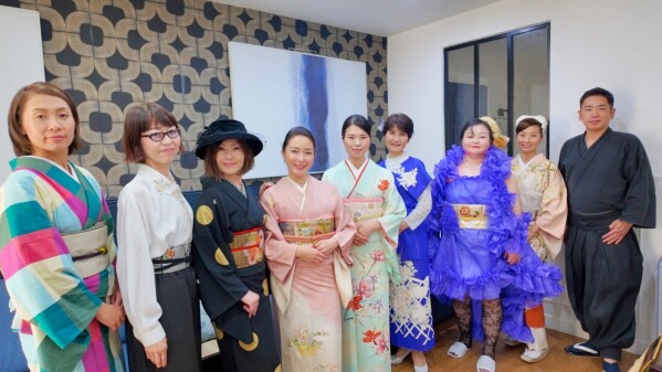 着物姿でパリの街を歩く「あわい」のメンバー。