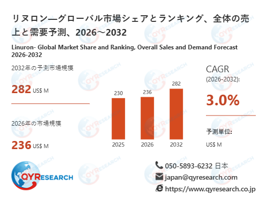 リヌロンの世界市場規模は、2025年には約230百万米ドルに達すると推計されています。2026年には236百万米ドル規模へと拡大する見込みであり、その後も安定した成長軌道を維持すると想定されています。2026年から2032年の期間においては、年平均成長率(CAGR)3.0%で推移し、2032年には市場規模が約282百万米ドルに達する見通しです。