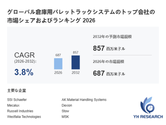 YHResearch調査チームの最新レポート「グローバル倉庫用パレットラックシステムのトップ会社の市場シェアおよびランキング 2026」によると、2026年の687百万米ドルから2032年には857百万米ドルに成長し、2026年から2032年の間にCAGRは3.8%になると予測されています。