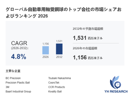 YHResearch調査チームの最新レポート「グローバル自動車用軸受鋼球のトップ会社の市場シェアおよびランキング 2026」によると、2026年の1156百万米ドルから2032年には1531百万米ドルに成長し、2026年から2032年の間にCAGRは4.8%になると予測されています。