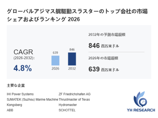 YHResearch調査チームの最新レポート「グローバルアジマス?駆動スラスターのトップ会社の市場シェアおよびランキング 2026」によると、2026年の639百万米ドルから2032年には846百万米ドルに成長し、2026年から2032年の間にCAGRは4.8%になると予測されています。