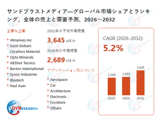 サンドブラストメディアの世界市場規模は2025年に2569百万米ドルに達し、2026年には2689百万米ドルに拡大すると予測されております。2026年から2032年の期間においては、5.2%の年平均成長率(CAGR)を維持し、最終的に2032年の市場規模は3645百万ドルに達すると予測されております。