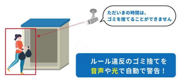 ルールで定められた曜日や時間外にゴミを捨てに来た人物をAIが検知し、音声と光で警告します。