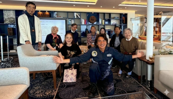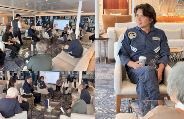 当日は、歴史の講義を担当しているもう一人の特別講師川村氏とクルーズ乗船者と共に約1時間、講演では語りきれない瓜生旅行や民間宇宙開拓事業の最新情報や歴史に関わる深い話についてフリートーク形式で懇談しながらお客様との交流を行いました。