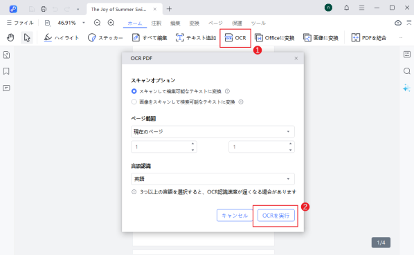 PDFを開くと、自動的にOCRが適用される場合がありますが、手動で実行することも可能です。「ツール」から「スキャンを強化」を選び、「テキストを認識」をクリックします。その後、文書の言語を設定する画面が表示されるので、適切な言語を選択して認識精度を高めます。