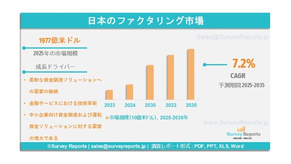 Surveyreportsの専門家は日本のファクタリング市場に関する調査を分析し、2025年における市場規模が1,977億米ドルであったことを明らかにした。さらに、日本のファクタリング市場は2035年末までに3,706億米ドルに達する収益が見込まれている。日本のファクタリング市場は、2025年から2035年の予測期間において、約7.2%の年平均成長率(CAGR)で成長すると提案されている。
