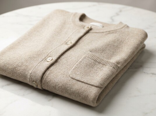 このカーディガンの魅力は、飾りすぎないのに一枚でサマになる計算されたシルエットにあります。