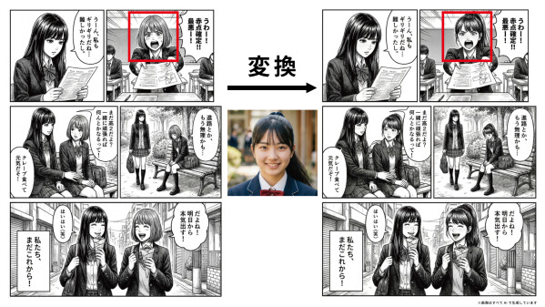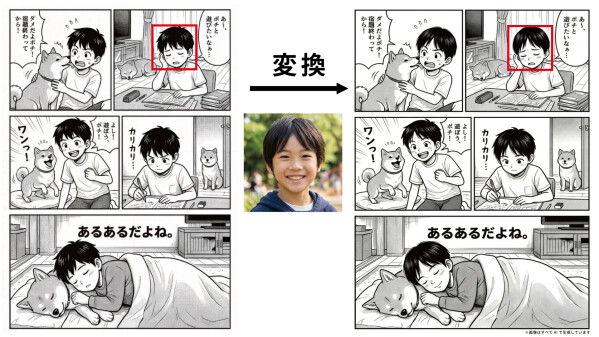 漫画の主人公を自分自身に変換するAI技術です。