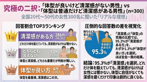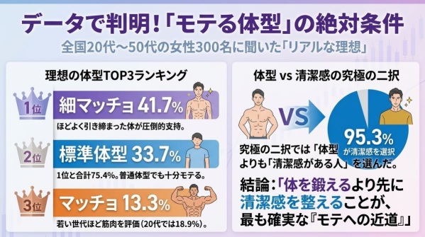 体型に自信がない男性にとって朗報と言えるのは、95.3%の女性が「体型より清潔感」を選んでいるという事実。体を鍛える前に、まず清潔感を整えることが、最も確実で即効性のある「モテへの近道」であることを、300人のデータが証明しています。