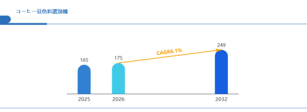 Global reports調査チームの最新レポート「グローバルコーヒー豆色彩選別機市場規模、主要企業シェア、ランキング分析レポート【2026年版】」によると、グローバルコーヒー豆色彩選別機市場は2025年の165百万米ドルから2032年には249百万米ドルに成長し、2026年の市場規模は約175百万米ドルと推計されており、2026-2032年のCAGR(年間成長率)が6.1%に達すると予測されている。