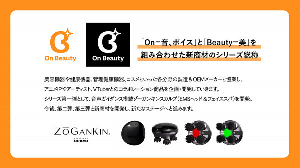 「On=音、ボイス」と「Beauty=美」を組み合わせた新商材のシリーズ総称。美容機器や健康機器、管理健康機器、コスメといった各分野の製造・OEMメーカーと協業し、アニメIPやアーティスト、VTuberとのコラボレーション商品を企画・開発していきます。