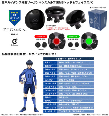 本コラボレーションモデルは、本体天面にレーザー刻印を施し、「潔 世一」の新規録り下ろしボイスを搭載。電源オンやオフ、Scalpモード、Faceモード、回転レベル、EMS等、各操作に応じてガイドしてくれるオリジナルボイス計15ワードを楽しみながら頭皮や表情筋のケアが可能です。