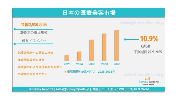 Surveyreportsの専門家による分析によれば、日本医療美容市場規模は2025年に12億2,530万米ドルに達したとされる。さらに、2035年末までに31億1,560万米ドルに達する収益が見込まれている。日本医療美容市場は、2025年から2035年の予測期間において、約10.9%の年平均成長率(CAGR)で成長すると予測されている。