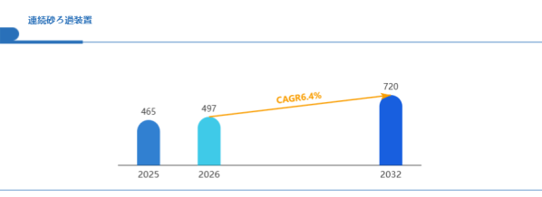 Global reports調査チームの最新レポート「グローバル連続砂ろ過装置市場規模、主要企業シェア、ランキング分析レポート【2026年版】」によると、グローバル連続砂ろ過装置市場は2025年の465百万米ドルから2032年には720百万米ドルに成長し、2026年の市場規模は約497百万米ドルと推計されており、2026-2032年のCAGR(年間成長率)が6.4%に達すると予測されている。