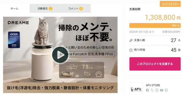 GREEN FUNDINGにてDreame Furcatch 空気清浄機 FP10が2026年3月26日に目標金額を達成しました。