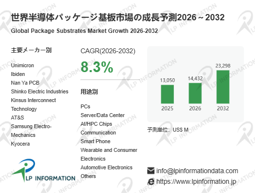 LP Information調査チームの最新レポートである「世界半導体パッケージ基板市場の成長予測2026~2032」(https://www.lpinformation.jp/reports/602234/package-substrates)によると、2026年から2032年の予測期間中のCAGRが8.3%で、2032年までにグローバル半導体パッケージ基板市場規模は232.98億米ドルに達すると予測されている。足元の調整局面は、最終需要の鈍化と在庫の歪み、顧客の認定・立上げタイミングの遅れが同時に起きやすいことを示す。高性能計算、AIサーバー、先端パッケージの普及により、基板は大型・高多層・高精細へとシフトし、設備投資と技術認定を通過できる供給者が限られる。結果として、需要回復局面では供給制約が価格・ミックス改善に波及しやすい産業構造となる。