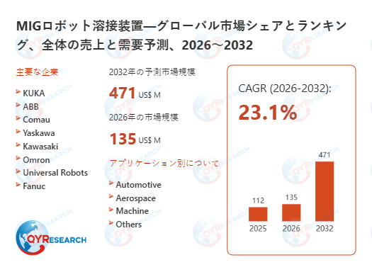 MIGロボット溶接装置の世界市場規模は、2025年には約112百万米ドルに達すると推計されています。2026年には135百万米ドル規模へと拡大する見込みであり、その後も安定した成長軌道を維持すると想定されています。2026年から2032年の期間においては、年平均成長率(CAGR)23.1%で推移し、2032年には市場規模が約471百万米ドルに達する見通しです。