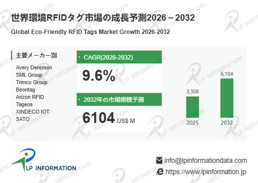 LP Information 調査チームのレポート「世界環境RFIDタグ市場の成長予測2026~2032」(https://www.lpinformation.jp/reports/598936/eco-friendly-rfid-tags)によれば、2025 年の 33.08 億米ドルから 、2032 年には 61.04 億米ドルへと規模が倍増する。世界の環境 RFID タグ市場は、各国のカーボンニュートラル目標達成への取り組み、流通業のデジタルトランスフォーメーション、小売業のスマート在庫管理導入拡大を背景に、2026~2032 年間も高い成長トレンドを維持する見込みである。欧州市場は環境規制の強化により先行して成長し、アジア太平洋地域は新興市場の経済発展と物流インフラ整備に伴い、年平均成長率 10% 以上の高成長が見込まれる。
