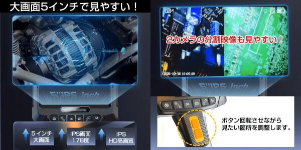 【モニター画面付き】:5インチ画面、2カメラの映像を分割して表示可能。
