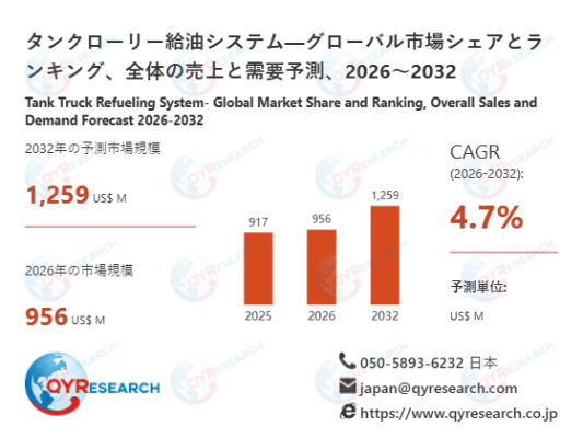 タンクローリー給油システムの世界市場規模は2025年に917百万米ドルに達し、2026年には956百万米ドルに拡大すると予測されております。2026年から2032年の期間においては、4.7%の年平均成長率(CAGR)を維持し、最終的に2032年の市場規模は1259百万ドルに達すると予測されております。