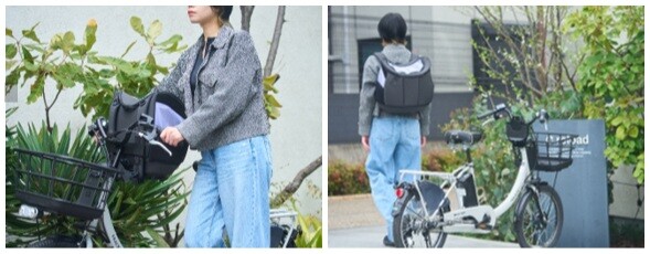 「ハグバディー」は、従来のバスケットとは違い、ハンドルの内側に固定します。近い距離でいつでも様子が確認できるため、飼い主・ペットともに安心感を持って移動できます。外の景色を一緒に楽しめるよう、安全性を確保しつつ、走行中もペットが顔を出せる蓋のデザインにこだわりました。固定には、当社の自転車用バスケットなどで採用している独自の着脱機構を応用。強固な固定力を持ちながら、ワンタッチで簡単に取り外せるため、自転車での移動から到着後の徒歩移動まで、このリュックひとつでスムーズに切り替えられる新しいスタイルを実現しました。