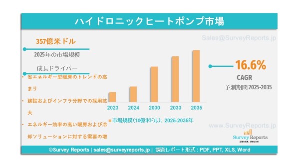 Surveyreportsの専門家による分析によれば、水循環式ヒートポンプ市場規模は2025年に357億米ドルに達したとされる。さらに、2035年末までには1,378億米ドルに達する収益が見込まれている。水循環式ヒートポンプ市場は、2025年から2035年の予測期間において、約16.6%の年平均成長率(CAGR)で成長すると提案されている。
