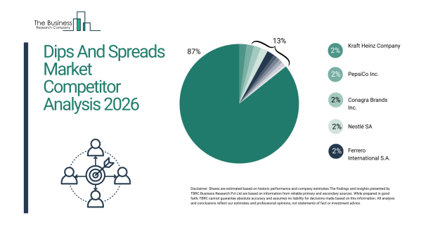ディップおよびスプレッド市場は比較的分散した構造であり、上位10社で2024年の総収益の13%を占めている。クラフト・ハインツはチーズ系ディップや特製調味料の幅広い製品群を活用し、世界市場で2%のシェアを持つリーダーである。その他、ペプシコ、コナグラ・ブランズ、ネスレ、フェレロ・インターナショナルといった主要企業も、多様な製品ラインと戦略的買収を通じて強い地位を維持している。これらの企業は、コールドチェーンの最適化と味の多様化に注力し、地域企業やプライベートブランドとの競争優位性を確保している。