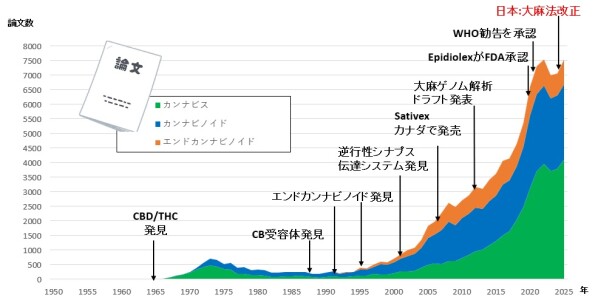 図 学術データベースPubMedの大麻・カンナビノイド関連論文数の推移(1950ー2025年)