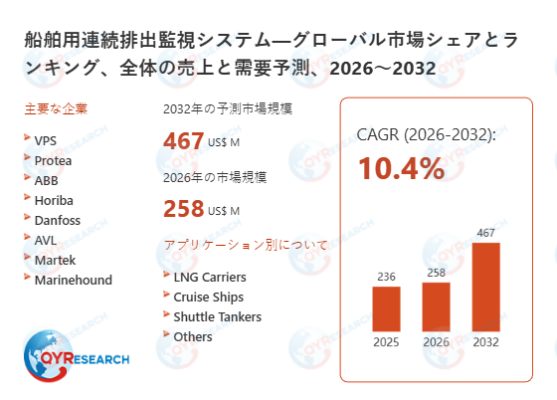 2025年における船舶用連続排出監視システムの世界市場規模は、236百万米ドルと予測され、2026年から2032年の予測期間において、年間平均成長率(CAGR)10.4%で成長し、2032年までに467百万米ドルに達すると予測されている。