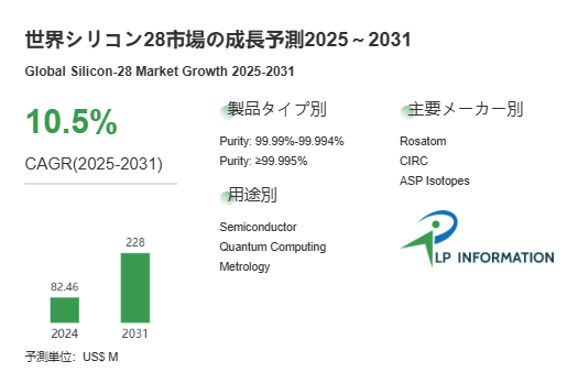 LP Information の「世界シリコン28市場の成長予測2025~2031」(https://www.lpinformation.jp/reports/196675/silicon-28)によれば、予測期間中の複合年間成長率(CAGR)は約 10.5% で推移し、2031年にはグローバル市場規模が 2.28億米ドル に達する見込みである。 この成長は、半導体用途の急増が主なドライバーで、特に量子コンピュータ、AI 向け半導体、大規模データセンター用途などハイエンド需要の拡大が予見される。レポートによると、2024年時点で世界市場は約0.83億米ドルであったが、今後数年間で倍以上の市場へと拡大する計算である。 また、地域別では北米、アジア太平洋、ヨーロッパが中心であり、それぞれ高い成長が予測されている。特にアジア太平洋地域では、半導体製造の拡大と再編により需要が急増する可能性が高く、今後の鍵となる市場である。