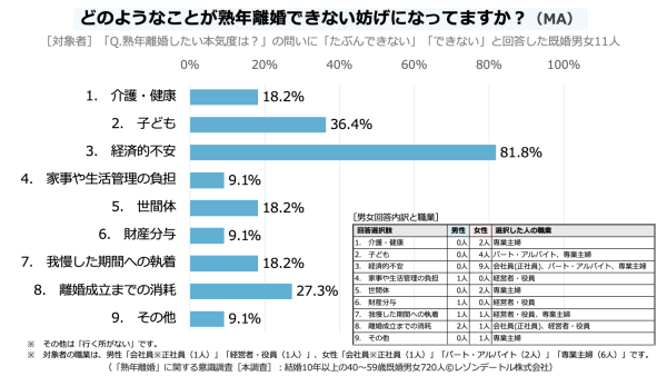 「どのようなことが熟年離婚できない妨げになっているか」を、以下9つの選択肢から回答(MA)を得ています。
