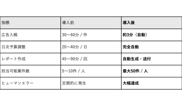 広告代理業務の入稿・運用管理・レポーティングは、その大部分が今なお人手に依存しています。クライアントごとに異なるフォーマットや運用ルール、複数の広告プラットフォームにまたがる設定作業は、熟練担当者でも1案件あたり週3~5時間以上を要することが常態化しています。