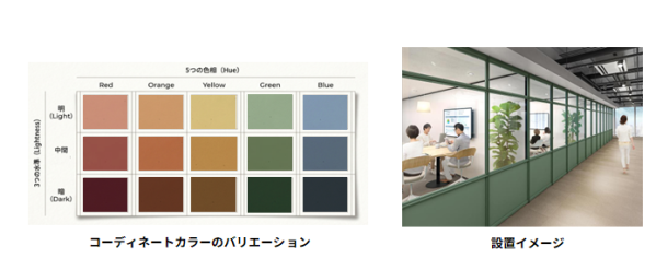今回コマニーが提案するコーディネートカラーは「調和」をコンセプトとしています。強いコントラストで目立たせるのではなく、ベースカラーや家具、ファブリックと自然になじみ、空間全体に溶け込む色味を目指しました。これにより、空間全体の統一感を高め、より快適で、心地よい環境づくりにつながるカラー提案を実現しています。