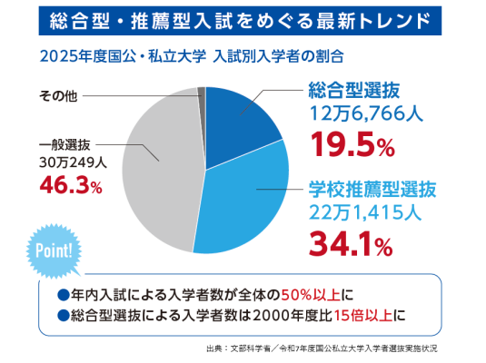 近年、総合型選抜・学校推薦型選抜といった「年内入試」は拡大を続けており、私立大学では入学者の半数以上を占めるケースも見られます。