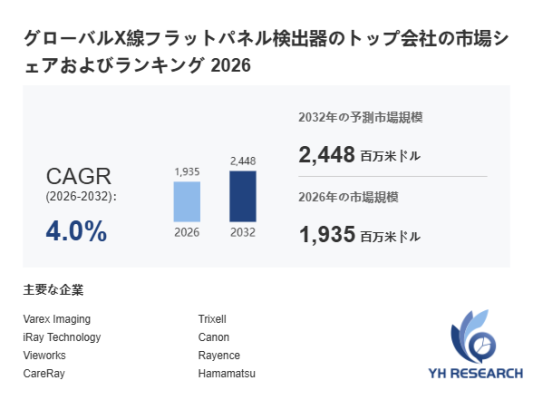 YHResearch調査チームの最新レポート「グローバルX線フラットパネル検出器のトップ会社の市場シェアおよびランキング 2026」によると、2026年の2448百万米ドルから2032年には1935百万米ドルに成長し、2026年から2032年の間にCAGRは4.0%になると予測されています。