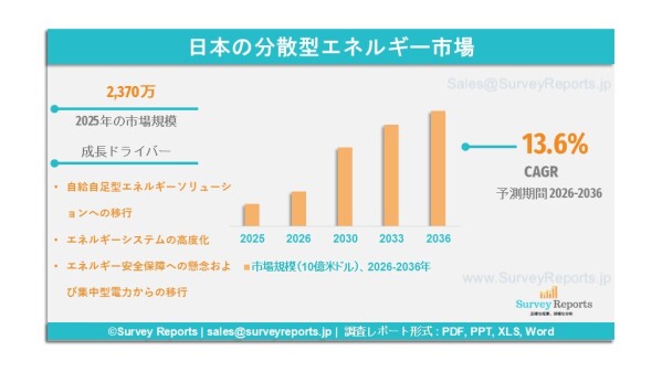 Surveyreportsの専門家による分析によれば、日本分散型エネルギー市場の規模は2025年に2370万米ドルに達したとされる。さらに、同市場は2036年末までに7990万米ドルに到達すると予測されている。また、2026年から2036年の予測期間において、年平均成長率(CAGR)は約13.6%で成長すると見込まれている。