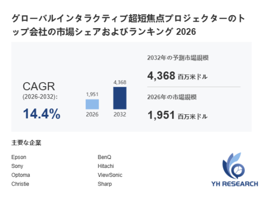 YHResearch調査チームの最新レポート「グローバルインタラクティブ超短焦点プロジェクターのトップ会社の市場シェアおよびランキング 2026」によると、2026年の1951百万米ドルから2032年には4368百万米ドルに成長し、2026年から2032年の間にCAGRは14.4%になると予測されています。