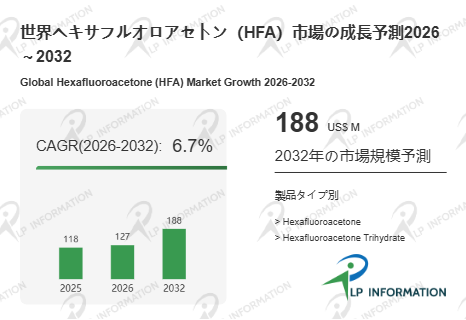 LP Information調査チームの最新レポートである「世界ヘキサフルオロアセトン(HFA)市場の成長予測2026~2032」(https://www.lpinformation.jp/reports/601194/hexafluoroacetone--hfa)によると、2026年から2032年の予測期間中のCAGRが6.7%で、2032年までにグローバルヘキサフルオロアセトン(HFA)市場規模は1.88億米ドルに達すると予測されている。前半の高成長は、下流の高付加価値用途が量産局面へ移る過程で、サプライチェーンが在庫と供給能力を厚くする動きが重なった構図である。後半の伸び率低下は、需要消失ではなく、需要の定着と供給体制の整備が進み、成長ドライバーが新規用途の創出と高純度領域のアップグレードへ移ることを示唆する。市場の主戦場は、数量の拡大から、規格適合、安定供給、工程安全、環境対応を含む総合力へ移り、結果として価格形成も汎用品的な競争から、認証・監査に耐える供給者のプレミアムへ分岐しやすい局面に入る。